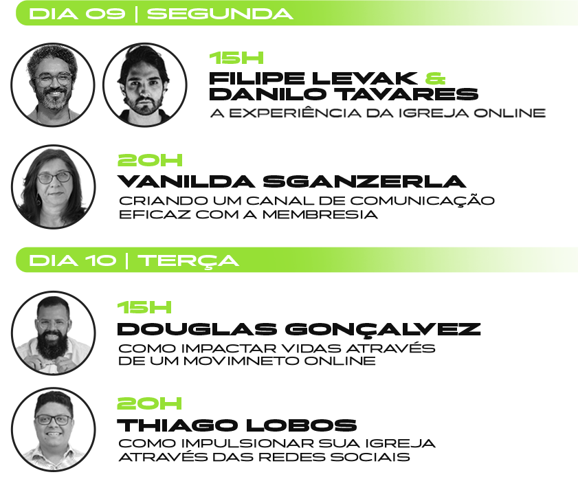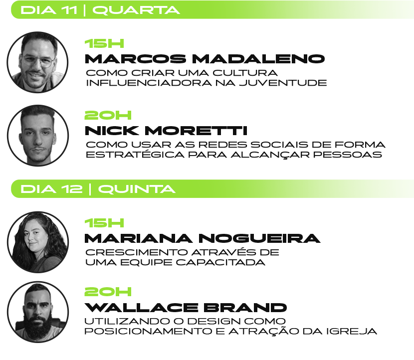 Serão 4 dias nos quais você vai aprender a como otimizar a comunicação da sua igreja, e como fazer com que a palavra de Deus chegue ao máximo de pessoas possível, e também a   como manter os membros da sua igreja engajados e presentes na igreja.